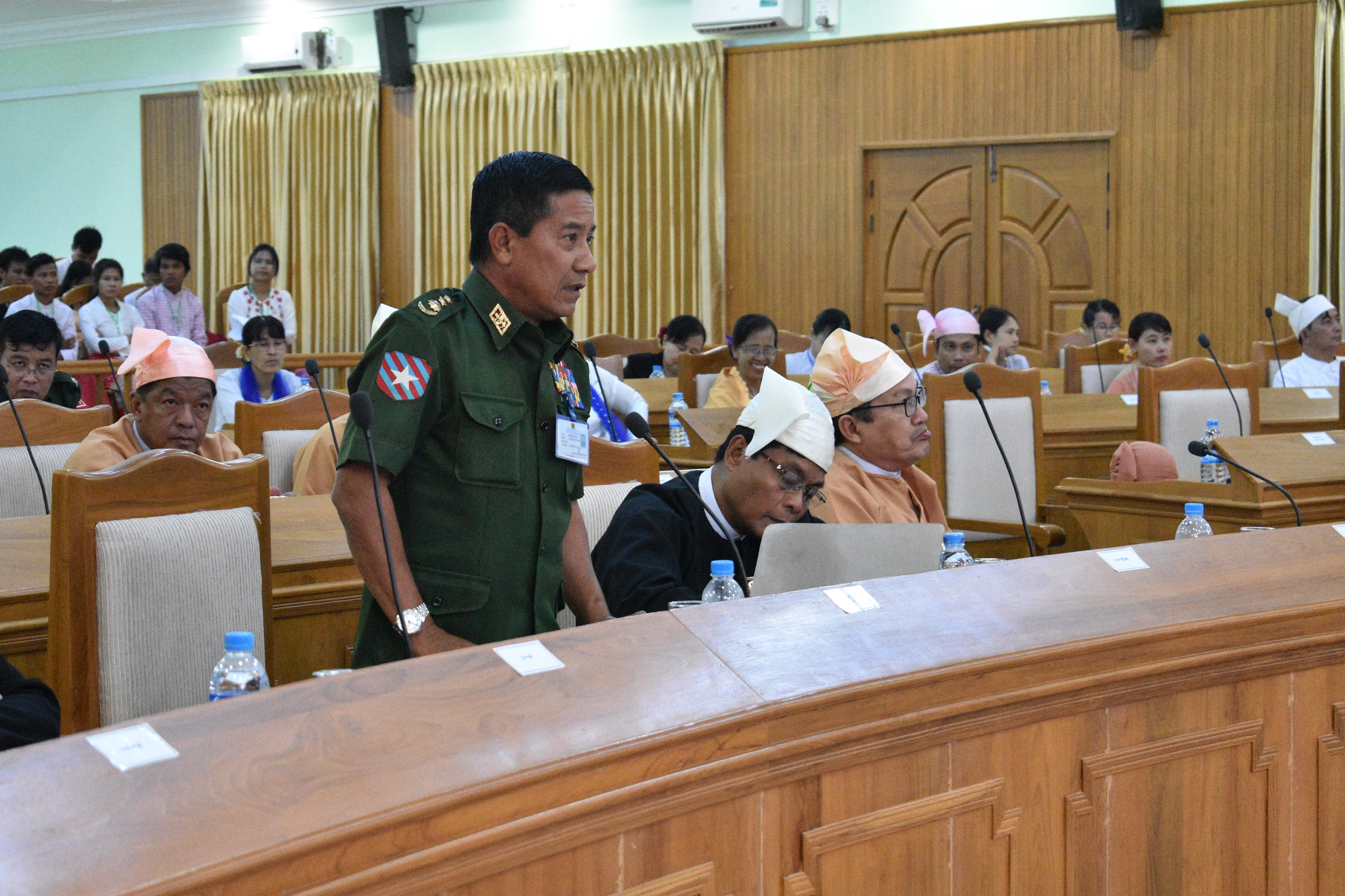 (၅) ဗိုလ်မှူးဇော်လင်းအောင်၊ တပ်မတော်သားလွှတ်တော်ကိုယ်စားလှယ်မှ ကျိုက်မရောမြို့နယ်၊ ဘာဘူကုန်းကျေးရွာအုပ်စုရှိ လယ်မြေများအားချောင်း/မြောင်းများပိတ်၍ လယ်မစိုက်နိုင် အောင် ပြုလုပ်နေမှုများနှင့် ပတ်သက်၍ သိရှိလိုသောမေးခွန်းနှင့်စပ်လျဉ်း၍ စိုက်ပျိုးမွေးမြူရေးနှင့်ပို့ဆောင်ဆက်သွယ်ရေးဝန်ကြီး၊ ဦးထွန်းဌေးမှ ကျိုက်မရော မြို့နယ်အတွင်း နွေရာသီတွင် လုပ်ငန်းဆောင်ရွက်ရန်အတွက် သော်လည်းကောင်း၊ ကုန်ထုတ်လုပ်ငန်းအဖြစ်သော်လည်းကောင်း၊ အချို့ချောင်း/မြောင်းများကို နွေရာသီ တွင်ပိတ်ဆို့ထားတတ်ကြပါသည်။ မိုးရာသီကျရောက်သည့် အချိန်တွင် ချောင်း/မြောင်းများ ပိတ်ဆို့ထားသောနေရာများအား ကွင်းဆင်းစစ်ဆေး၍ ရေစီးရေလာကိုအဟန့်အတား ဖြစ်၊မဖြစ် စူးစမ်းလေ့လာပြီး အဟန့်အတားဖြစ်ပါက ရေစီးရေလာကောင်းမွန်အောင် ဆောင်ရွက်သွားမည်ဖြစ်ကြောင်း၊ ငါးခူတောင်-ကျုံဝမ်းမြောင်းနှင့် အလယ်တောင်ကျုံဝမ်း မြောင်း၊ နှစ်မြောင်းကြားတွင် နွေစပါးစိုက်ပျိုးလျက်ရှိပါကြောင်း၊ ၂၀၁၈-၂၀၁၉ခုနှစ်တွင် နွေစပါးဧက (၅၀၀)ကျော်စိုက်ပျိုးနိုင်ရန်အတွက် လက်ရှိအခြေအနေတွင်ရှှိသော မြောင်း အတိမ်အနက်အရ ရေစီးရေလာကောင်းနေပါ၍ နွေရာသီတွင် ရေချိုဝင်ရောက်ပြီး စိုက်ပျိုးနိုင်မည်ဖြစ်ပါကြောင်း၊ ခရုံငူလမ်းဆုံမှ ”ကြံ” စီမံကိန်းများသို့ သွားလာသော တံတား(၃)စင်းနှင့် မိုးရာသီသွားလာနိုင်သော လမ်းအဖြစ်ဆောင်ရွက်ပေးနိုင်ရေးကိစ္စနှင့် ပတ်သက်၍ ၂၀၁၈-၂၀၁၉ဘဏ္ဍာရေးနှစ်တွင် လျာထားခြင်းမရှိပါ။ ကုမ္ပဏီမှ ပြန်လည် ပြုပြင်ပေးနိုင်ခြင်းရှိ/မရှိနှင့် စပ်လျဉ်း၍ သက်ဆိုင်ရာဌာနများအား ကွင်းဆင်းစိစစ်စေပြီး ပြည်နယ်အစိုးရအဖွဲ့ထံ ပြန်လည်တင်ပြစေမည်ဖြစ်ကြောင်းနှင့် ၁၉၉၈-၁၉၉၉ခုနှစ်၊ လှပ်မြေဖော်ထုတ်စိုက်ပျိုးမှုအတွက် ခရုံဂူဒေသရှိကျေးရွာ(၃)ရွာဖြစ်သော ခရုံ၊ ဘာဘူကုန်း၊ ကျုံဝမ်းကျေးရွာအုပ်စုများတွင် ဌာနဆိုင်ရာနှင့် တပ်ရင်း/တပ်ဖွဲ့များမှာ စိုက်ပျိုးလုပ်ကိုင် နိုင်ရန်အတွက် ပြည်နယ်(ပယက)အစီအစဉ်ဖြင့် မြေနေရာချထားပေးခဲ့ရာ တပ်ရင်း/တပ်ဖွဲ့၊ ဌာနဆိုင်ရာ(၃၅)ခုတို့အား ဧရိယာ(၁၉၂၇)ဧကကို ချထားပေးခဲ့ပါကြောင်း စိစစ်တွေ့ရှိရပြီး၊ ၎င်းချထားပေးသော မြေအတွင်းမှတပ်ရင်း/တပ်ဖွဲ့နှင့်ဌာနဆိုင်ရာ(၁၂)ခုမှ ပုံစံ(၇)ရရှိပြီး ဧရိယာမှာ (၁၁၂၇)ဧကဖြစ်ပြီး၊ ၎င်းဧရိယာတွင် အမှန်တကယ် နှစ်စဉ်စပါးစိုက်ပျိုးလျက် ရှိသော ဧရိယာမှာ(၆၇၅)ဧကရှိပါကြောင်း၊ ၎င်းဧရိယာအား ချန်လှပ်ပြီးနှစ်ပေါင်းများစွာ စိုက်ပျိုးမှုမရှိသော လှပ်မြေဧရိယာများတွင် စိုက်ပျိုးရေးအတွက် ရင်းနှီးမြှုပ်နှံလိုသော တောင်သူများနှင့်ကုမ္ပဏီများမှ လာရောက်လုပ်ကိုင်လိုပါက သက်ဆိုင်ရာမြေချထားခ