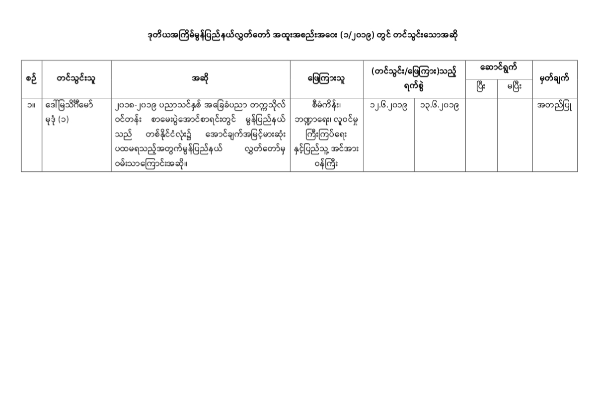 ဒုတိယအကြိမ်မွန်ပြည်နယ်လွှတ်တော် အထူးအစည်းအဝေး (၁/၂၀၁၉)တွင် အဆို(၁)ခု တင်သွင်းခဲ့ပါသည်။