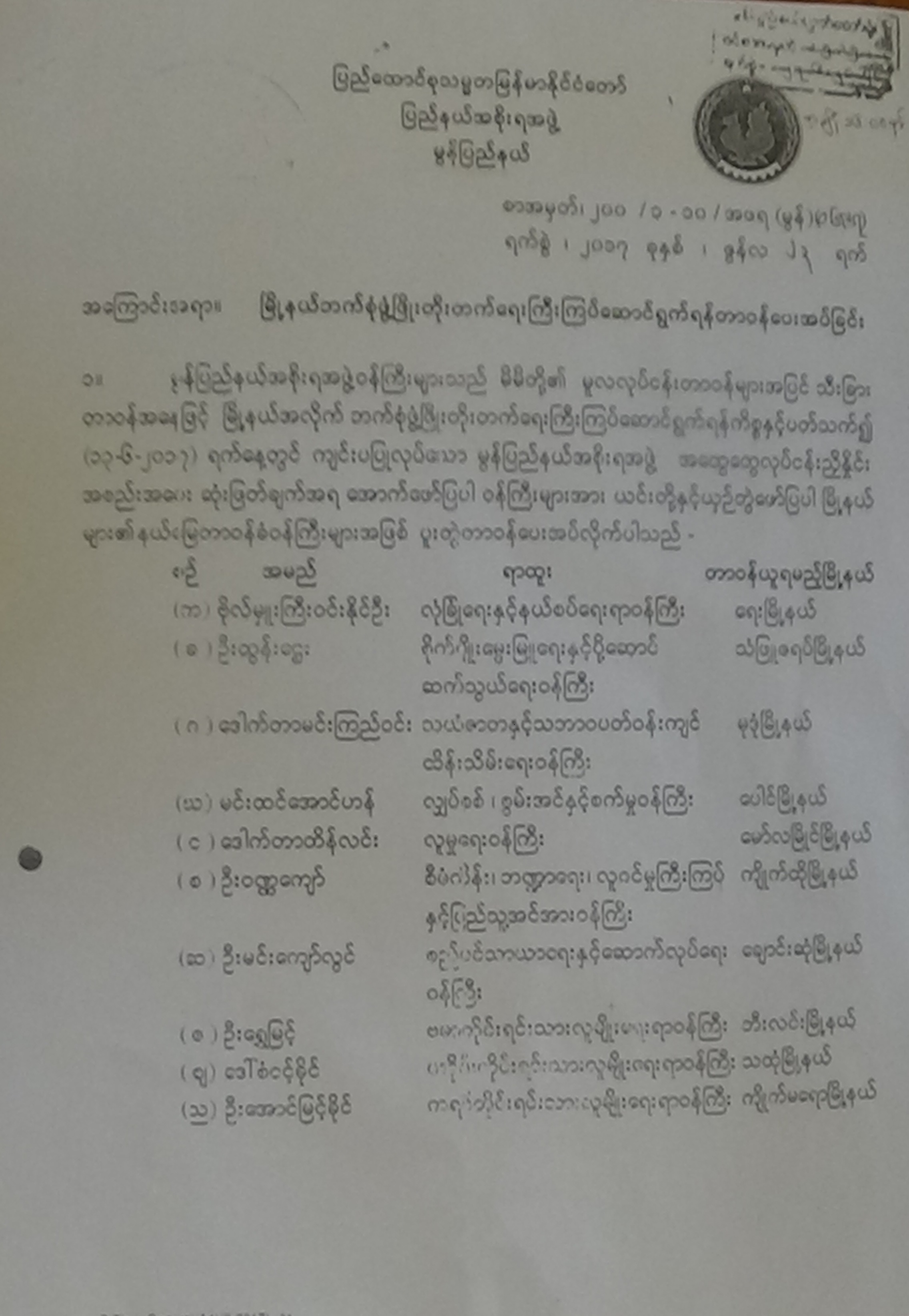 မြို့နယ်ဘက်စုံဖွံ့ဖြိုးတိုးတက်ရေးကြီးကြပ်ဆောင်ရွက်ရန်တာဝန်ပေးအပ်ခြင်း