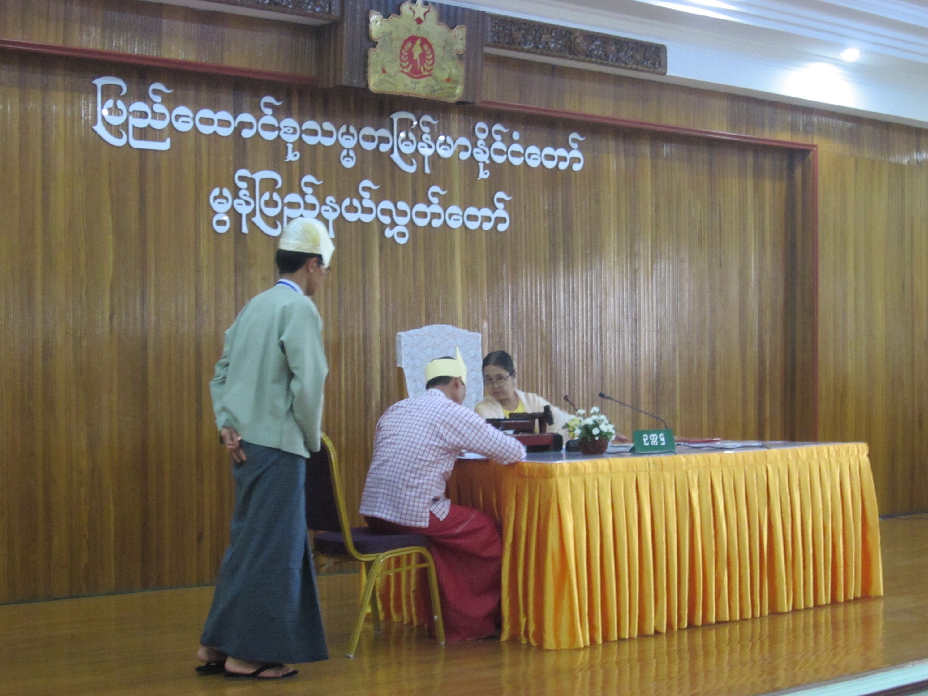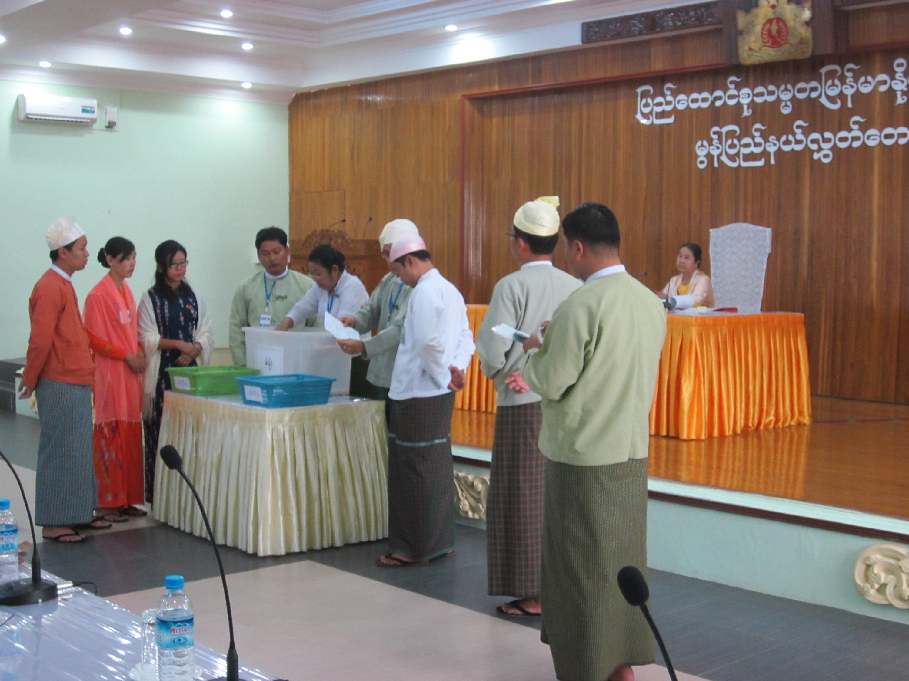 ဒုတိယအကြိမ်မွန်ပြည်နယ်လွှတ်တော်ပထမပုံမှန်အစည်းအဝေး (ဆဋ္ဌမနေ့) ကို (၅-၄-၂၀၁၆)ရက်နေ့၊ နံနက် (၁၀း၀၀)နာရီအချိန်တွင် မွန်ပြည်နယ်လွှတ်တော်ရုံးအစည်းအဝေးခန်းမ၌ ကျင်းပပြုလုပ်ပါသည်။ အစည်းအဝေးသို့ တက်ရောက်ခွင့်ရှိသည့် ပြည်နယ်လွှတ်တော်ကိုယ်စားလှယ်(၃၁)ဦးအနက် (၃၁)ဦး တက်ရောက်မှု အခြေအနေကို မှတ်တမ်း တင်ခြင်း၊ မွန်ပြည်နယ်လွှတ်တော်ဒုတိယဥက္ကဋ္ဌအဖြစ် ရွေးချယ်တင်မြှောက်ရေးနှင့်ပတ်သက်၍ အဆိုပြုလွှာတောင်းခံခဲ့ရာ ချောင်းဆုံမြို့နယ်၊ မဲဆန္ဒနယ်အမှတ် (၁)မှ ဒေါက်တာအောင်နိုင်ဦးအား တပ်မတော်သား လွှတ်တော်ကိုယ်စားလှယ် ဗိုလ်မှူးဇော်လင်းအောင်က ထောက်ခံပြီး ကျိုက်မရောမြို့နယ်၊ မဲဆန္ဒနယ်အမှတ် (၂)မှ ဦးမင်းအောင်မွန်က တင်သွင်းခြင်း၊ ဘီလင်းမြို့နယ်၊ မဲဆန္ဒနယ်အမှတ်(၁)မှ ဒေါက်တာခင်နိုင်ဦးအား ချောင်းဆုံမြို့နယ်၊ မဲဆန္ဒနယ်အမှတ်(၂)မှ ဒေါ်ကြည်ကြည်မြက ထောက်ခံပြီး ပေါင်မြို့နယ်၊ မဲဆန္ဒနယ်အမှတ်(၂)မှ ဦးဇော်ဇော်ထူးက တင်သွင်းခြင်းတို့ကြောင့် အဆိုပြုသူ (၁)ဦးထက်ပိုသဖြင့် ဆန္ဒမဲ ပေးခြင်းဆောင်ရွက်ရာ ထုတ်ယူဆန္ဒမဲလက်မှတ် (၃၀)တွင် ဒေါက်တာအောင်နိုင်ဦးက (၁၃)မဲ၊ ဒေါက်တာခင်နိုင်ဦးက (၁၂)မဲ၊ ပယ်မဲ(၅)မဲ ရရှိသဖြင့် ချောင်းဆုံမြို့နယ်၊ မဲဆန္ဒနယ်အမှတ် (၁)မှ ဒေါက်တာအောင်နိုင်ဦးအား မွန်ပြည်နယ်လွှတ်တော် ဒုတိယဥက္ကဋ္ဌအဖြစ် ရွေးချယ်တင်မြှောက်ကြောင်း ပြည်နယ်လွှတ်တော် ဥက္ကဋ္ဌမှ ကြေညာခြင်း၊ ပြည်နယ်လွှတ်တော် ဒုတိယဥက္ကဋ္ဌမှ လွှတ်တော်၏ ရှေ့မှောက်တွင် ကတိသစ္စာပြုခြင်းနှင့်ကတိသစ္စာ ပြုလွှာပေါ်တွင် လက်မှတ်ရေးထိုးခြင်း၊ ပြည်နယ်လွှတ်တော်ဥက္ကဋ္ဌက ဘဏ္ဍာရေး၊ စီမံကိန်းနှင့်စီးပွားရေးဆိုင်ရာ ကိစ္စရပ်များ လေ့လာသုံးသပ်ရေးကော်မတီတွင် ပါဝင်သင့်သည့် အဖွဲ့ဝင်ဦးရေ၊ အဖွဲ့ဝင်များ၏ အမည်စာရင်း၊ ကော်မတီဥက္ကဋ္ဌနှင့် အတွင်းရေးမှူးတို့၏ အမည်စာရင်းကို ပြည်နယ်လွှတ်တော်သို့ တင်ပြခြင်း၊ ကော်မတီ၏ လုပ်ငန်းတာဝန်၊ လုပ်ပိုင်ခွင့်၊ ရပိုင်ခွင့်၊ သက်တမ်းသတ်မှတ်ခြင်းအား ကော်မတီအတွင်းရေးမှူးဒေါက်တာမင်းစိုးလင်း၊ ရေးမြို့နယ်၊ မဲဆန္ဒနယ်အမှတ် (၁)မှ ပြည်နယ်လွှတ်တော်သို့ တင်ပြခြင်း၊ ပြည်နယ်လွှတ်တော်ဥက္ကဋ္ဌက သဘာဝပတ်ဝန်းကျင်ထိန်းသိမ်းကာကွယ်စောင့်ရှောက်ရေး ကော်မတီတွင် ပါဝင်သင့်သည့် အဖွဲ့ဝင်ဦးရေ၊ အဖွဲ့ဝင်များ၏ အမည်စာရင်း၊ ကော်မတီဥက္ကဋ္ဌနှင့်အတွင်းရေးမှူးတို့၏ အမည်စာရင်းကို ပြည်နယ် လွှတ်တော်သို့ တင်ပြခြင်း၊ ကော်မတီ၏ လုပ်ငန်းတာဝန်၊ လုပ်ပိုင်ခွင့်၊ ရပိုင်ခွင့်၊ သက်တမ်း သတ်မှတ်ခြင်းအား ကော်မတီဥက္ကဋ္ဌ ဒေါက်တာအေးဇံ၊ ကျိုက်ထိုမြို့နယ်၊ မဲဆန္ဒနယ်အမှတ် (၂)မှ ပြည်နယ်လွှတ်တော်သို့ တင်ပြခြင်း၊ ဥပဒေပြုရေးဆိုင်ရာက