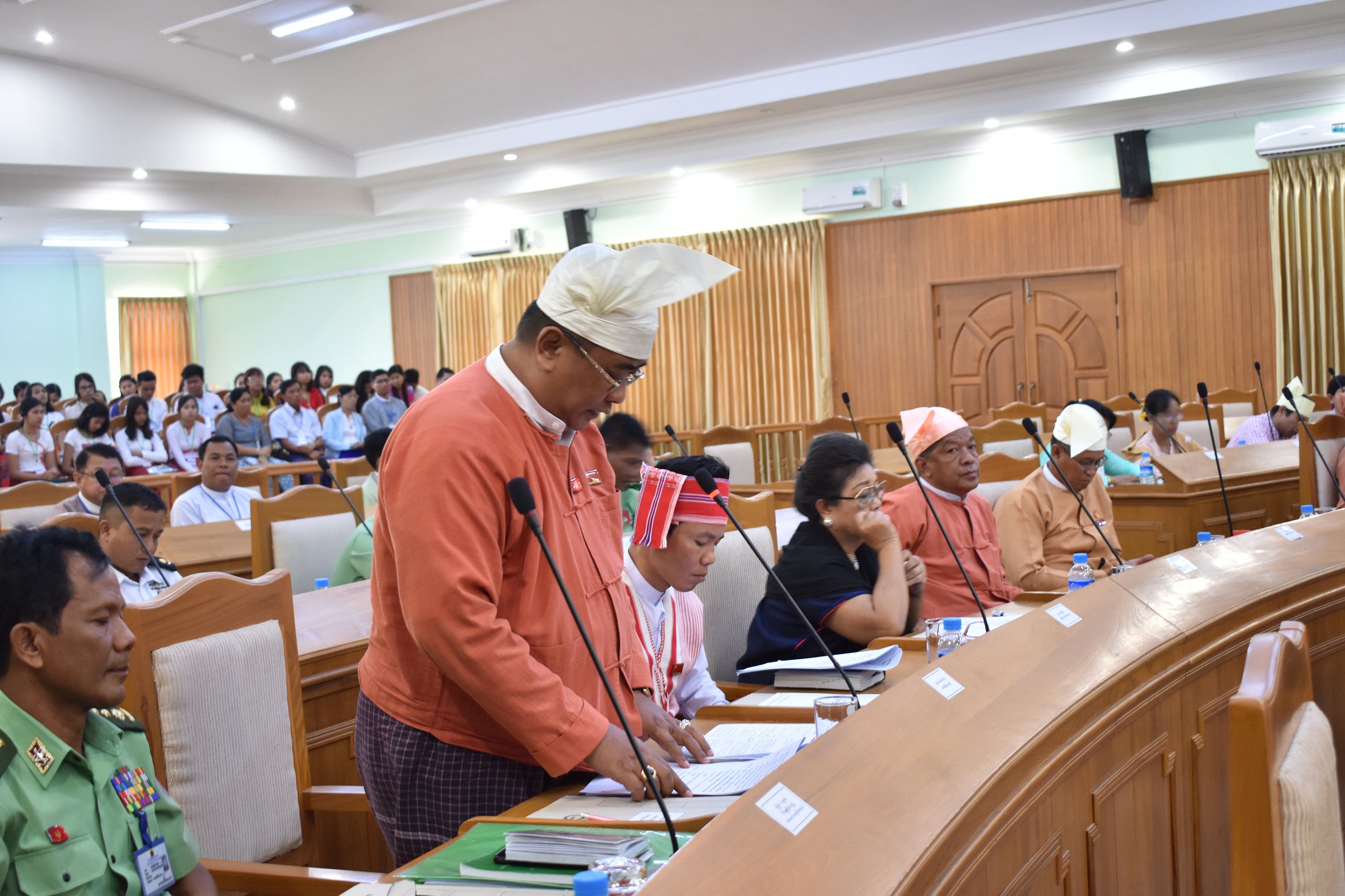 (၃) ဒေါ်ခိုင်ခိုင်လဲ့၊ ပြည်နယ်လွှတ်တော်ကိုယ်စားလှယ်၊ သထုံမြို့နယ်၊ မဲဆန္ဒနယ်အမှတ် (၁)မှ မေးမြန်းသော သဘာဝဘေးအန္တရာယ်တားဆီးကာကွယ်ရေးအတွက် Shelter Home များတည်ဆောက်သည့်ကိစ္စနှင့်ပတ်သက်၍ သိရှိလိုသောမေးခွန်းနှင့်စပ်လျဉ်း၍ လူမှုရေး ဝန်ကြီး ဒေါက်တာထိန်လင်း ကပြည်သူများ သဘာဝဘေးအန္တရာယ်များနှင့်ရင်ဆိုင်ကြုံတွေ့ လာပါက လုံခြုံစိတ်ချရသောနေရာသို့ ပြောင်းရွှေ့နေထိုင်နိုင်ရန်အတွက် Shelter Home များကို ဘီးလင်းမြို့နယ်တွင် လူ(၅၀၀)ဆံ့ (၂)လုံးနှင့် ချောင်းဆုံမြို့နယ်တွင် (၃)လုံးတည် ဆောက်ရန်လျာထားစီမံဆောင်ရွက်လျက်ရှိပါကြောင်း၊ အဆိုပါ Shelter Home များ တည်ဆောက်ရာတွင် သဘာဝဘေးအန္တရာယ်ဆိုင်ရာ စီမံခန့်ခွဲမှုဥပဒေပုဒ်မ ၁၃၊ ပုဒ်မခွဲ(ခ) နှင့် သဘာဝဘေးအန္တရာယ်ဆိုင်ရာစီမံခန့်ခွဲမှုနည်းဥပဒေများ၊ နည်းဥပဒေ ၂၄၊ နည်ဥပဒေခွဲ (ခ)တို့ပါ ထိလွယ်ရှလွယ်သောအုပ်စုအတွက် အဆင်ပြေချောမွေ့စွာသွားလာမှုလွယ်ကူစေ ရန် ဆင်ခြေလျောများထည့်သွင်းတည်ဆောက်နိုင်ရေးအတွက် တင်ဒါအောင်ကုမ္ပဏီများ အား ညှိနှိုင်းဆောင်ရွက်ပေးသွားမည်ဖြစ်ပါကြောင်းနှင့် ပြည်နယ်အတွင်း သဘာဝဘေး အန္တရာယ်တွေ့ကြုံလာရင်သော်လည်းကောင်း၊ ဇာတ်တိုက်လေ့ကျင့်ခန်းများပြုလုပ်ရာတွင် လည်းကောင်း၊ ထိခိုက်လွယ်သောအုပ်စုဖြစ်သည့် ကလေးသူငယ်များ၊ သက်ကြီးရွယ်အို များ၊ မသန်စွမ်းသူများနှင့်အမျိုးသမီးများအား ဦးစားပေးကူညီစောင့်ရှောက်မှုများထည့်သွင်း ဆောင်ရွက်ပေးသွားမည်ဖြစ်ကြောင်းဖြေကြားပါသည်။ ဆက်စပ်မေးခွန်းအနေဖြင့် ထိလွယ်ရှလွယ်သော Group ကြီးတစ်ခုလုံးအတွက် Structure ပိုင်း၊ အဆောက်အဦပုံစံ ပိုင်းကို တတ်နိုင်လို့ရှိရင် တင်ဒါအောင်ကုမ္ပဏီတစ်ခုတည်းအတွက်မဟုတ်ဘဲ ပုံစံစထုတ် ကတည်းက ဒီလိုအမျိုးအစားအတွက် တကယ့်ကိုကောင်းမွန်တဲ့ရည်ရွယ်ချက်တွေနဲ့ ဆောင်ရွက်ဖို့အစီအစဉ်ရှိ၊ မရှိ၊ တင်ဒါအောင်ကုမ္ပဏီနှင့်ညှိနိှုင်းတာမျိုးမဟုတ်ဘဲ ပုံသဏ္ဍာန် စင်္ပြီးထုတ်ကတည်းက သက်ဆိုင်ရာဝန်ကြီးဌာနအနေနဲ့ ဆောင်ရွက်ပေးဖို့အစီအစဉ်ရှိ၊ မရှိ မေးမြန်းရာ ကိုယ်စားလှယ်တော်ကြီးတင်ပြတဲ့အတိုင်း တင်ဒါအောင်ကုမ္ပဏီနှင့်မညှိနှိုင်းခင် ပုံစံရေးဆွဲသည့်အခါ ထိခိုက်လွယ်သောမျကိမမြင်အုပ်စုနှင့်နားမကြားသည့်အုပ်စုအတွက် ထည့်သွင်းဆောင်ရွက်သွားမည်ဆိုတဲ့အကြောင်း ပြန်လည်ဖြေကြားပါသည်။