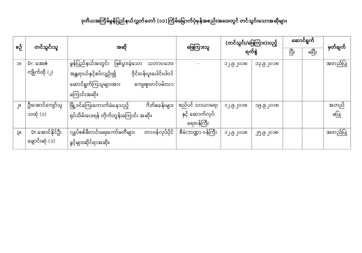 ဒုတိယအကြိမ်မွန်ပြည်နယ်လွှတ်တော် (၁၁)ကြိမ်မြောက်ပုံမှန်အစည်းအဝေးတွင်တင်သွင်းခဲ့သော အဆိုများ